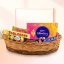 This delectable hamper consists of- - 1 Toblerone (100 gm) - 4 pc Ferrero Rocher - 1 Snickers (50 gm) - 1 Twix (50 gm) - 1 Mars (51 gm) - 1 Cadbury Celebration (126.4 gm) - 1 Basket. A thoughtful mix of classic favourites, this hamper brings together a collection of crowd-pleasing chocolates for any occasion. It includes a 100 gm Toblerone with its signature honey-almond nougat crunch, 4 pieces of Ferrero Rocher offering a layered texture of hazelnut and chocolate, a rich 50 gm Snickers bar packed with peanuts and caramel, a smooth 50 gm Twix combining biscuit, caramel and chocolate, and a 51 gm Mars bar known for its nougat and chocolate pairing. The set is completed with a 126.4 gm Cadbury Celebrations pack filled with assorted mini treats, all neatly arranged in a charming basket that makes gifting effortless and joyful.