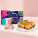 Elevate your gatherings with the Baklava Bliss Gift Set from Sangam Sweets! This delightful package includes an irresistible assortment of freshly made Desi Baklava, perfect for indulging in traditional sweetness. Accompanying this treat is a charming 6-inch teddy bear, bringing smiles to all ages. Plus, a Cadbury Celebration Chocolate Pack is included to satisfy every chocolate lover's cravings. Perfect for any occasion from birthdays to casual hangouts, this exclusive offering is available only in Bangalore. Make your celebrations unforgettable!