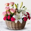 Online delivery of best wishes along with this Beautiful Basket of Roses, Carnations n Lilies for your dear ones. Product Details: Flowers: 6 Pink Roses, 10 Red Carnations and 2 Stem of White Lilies (2*3 buds/flowers) Gift Type: A Basket Arrangement