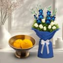 This gift combo includes: - Blue Tissue Wrapped 6 White Roses with 4 Blue Orchids Bouquet - Raj Bhog (10 Pcs) Experience the elegance of our White Roses N Blue Orchids Delight! This charming gift combo includes 6 graceful white roses and 4 stunning blue orchids, wrapped in a lovely blue tissue that enhances their beauty. Accompanying the bouquet are 10 pieces of mouthwatering Raj Bhog, known for its soft texture and unique flavor. An ideal gift for birthdays, promotions, or to simply say I care, this combo merges the charm of flowers with the richness of sweets, making your gesture unforgettable. Treat someone special with this delightful set!