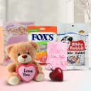 This set is consists of: - 1 Teddy with Heart - 1 White Rabbit Milk Chocolates Packet (108 gms) - 1 Packet of Heart Shaped Corazon Chocolates (150 gms) - 1 Heart Shaped Key Ring - 1 I Love You Card - 3 Pcs Heart Shaped Chocolates - 1 Packet of Foxs. Pamper the one you love with this beautiful and unique Love Special Combo.