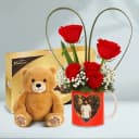 Beautiful Roses in Personalized Photo Mug with Ferrero Moments n Soft Teddy
