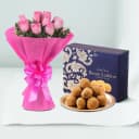 Sending Besan Ladoo (500 gm) with 10 Pink Rose Bouquet to your near ones. (Only Available at Delhi)