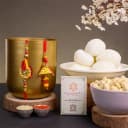 This gift includes: - A Kundan Bhaiya Bhabhi Rakhi Set by Rakhi Sutra (RBBS9524) - Rasgulla (500g) - Cashew (100g) - Complimentary Roli Tika N Chawal - Complimentary Message Card with Free Rakhi Delight your siblings with our Bhai Bhabhi Rakhi Delight Combo this Raksha Bandhan. It includes a stunning Kundan Bhaiya Bhabhi Rakhi Set by Rakhi Sutra, symbolizing the eternal bond of love and protection. This festive gift set also features 500 grams of mouth-watering Rasgulla to add sweetness to the celebration. Enjoy the perfect balance of flavors with 100 grams of crunchy cashews included in the set. To make the festivities complete, we offer complimentary Roli Tika N Chawal and a heartfelt message card. Share your love and blessings with this meticulously crafted gift set, perfect for celebrating the special bond you share with your brother and sister-in-law.