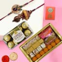 This gift set has: - Assorted Sweets (500 gms) - Bhaiya Bhabhi Rakhi - 200Gm Bhujia - 16 pcs Ferrero Rocher Chocolates - Free Rakhi, Roli Tika N Chawal included Celebrate the special bond of Raksha Bandhan with a thoughtful gift set that brings together taste and tradition. This hamper includes 500g of assorted sweets to add a touch of sweetness to the occasion, paired with a beautifully crafted Bhaiya Bhabhi Rakhi that symbolizes love and togetherness. To add a crispy twist, the combo comes with 200g of spicy Bhujia and 16 pieces of rich Ferrero Rocher chocolates that offer a delightful contrast of flavors. Also included are the essential Rakhi elements—Roli, Tika, and Chawal—to complete the ritual with love and care.