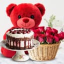 Embrace the essence of happiness with our Blissful Blooms and Sweet Treats collection! This delightful gift features a stunning arrangement of twelve enchanting red roses, each representing heartfelt sentiments. Complementing the floral beauty is a rich half-kilogram Chocolate Fudge cake, guaranteed to satisfy any chocolate lover. To add an element of warmth, we've included a plush 12-inch red teddy bear, perfect for cuddling up after enjoying cake. Ideal for celebrations or simply to brighten someone's day!