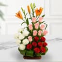 Express your deepest emotions with Blooms of Affection. This exquisite arrangement is a beautiful way to convey your love and admiration. Envision the stunned amazement of your loved one when they receive this carefully crafted bouquet. Featuring 8 romantic red roses symbolizing deep passion, 10 lovely pink roses that convey your heartfelt gratitude, and 8 pristine white carnations representing pure love, this bouquet tells a story of love. Enhanced by 3 graceful orange lilies, it radiates warmth and charm, perfect for any occasion, be it an anniversary, birthday, or simply a reminder that you care.
