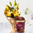 Bright Yellow Lily Bouquet with Kwality Walls Choco Brownie Fudge Ice Cream