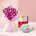 Canned Rossogolla from K.C.Das with Orchid Bouquet