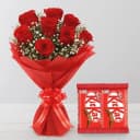 This gift combo has: - 10 Red Roses Bouquet - 2 Nestle Kit Kat (4 Fingers-10 gms) Greet your dear ones with this Captivating Combo of 10 Red Roses Bouquet with 2 Nestle Kit Kat (4 Fingers-10 gms) and make them feel special, loved and lucky.