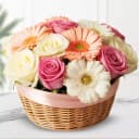 Make occasions grander with this Captivating White Pink n Peach Gerberas N Roses Basket and share the moment with your loved ones. Product Details: Flowers: 6 White and 6 Pink Roses, 3 Peach and 3 White Gerberas Gift Type: A Small Rounded Basket Arrangement