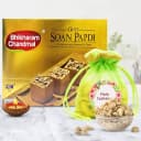 The Diwali Hamper consists of: - Diya - Ghee Soan Papri 500g, - Cashews,100 gm. Celebrate the festival of lights with our delightful Cashews And Festive Diya Hamper! This carefully curated hamper is the perfect gift for your loved ones to share in the joy and blessings of this auspicious occasion. As you unbox the hamper, you will find a beautifully crafted Diya that symbolizes the triumph of light over darkness. This Diya will not only brighten up your home but also add a touch of traditional elegance to your Diwali decorations. Indulge in the irresistible Ghee Soan Papri, a rich and flaky sweet treat that will transport your taste buds to heaven. Made with the finest quality ingredients, this 500g box of Soan Papri is sure to be a crowd-pleaser. To add a hint of crunch to your festive snacking, we have included 100g of premium quality cashews. These roasted and salted cashews are not only a healthy snack option but also a great addition to your Diwali mithai platter. The Cashews And Festive Diya Hamper is the perfect way to express your love, gratitude, and best wishes to your friends and family. It is a thoughtful gift that embodies the spirit of Diwali and will surely be cherished by your loved ones. So, spread happiness and light up someones Diwali with this exquisite hamper!