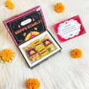 The Diwali Gift Box Consists Of: - 2 pieces Assorted Flavour Chocolates (Chocolate Flavours – Butterscotch Filling, Paan filling) - Diwali Theme Wishing Greeting Card - 30 grams Mixed Fruits - 30 grams Almonds - Diwali Theme Digital Print On Box Top and On Chocolates Get ready to celebrate the Festival of Lights with our exquisite Diwali Gift Box. This beautifully curated box is designed to bring joy and sweetness to your festivities. Inside, you will find an opulent selection of assorted flavour chocolates, each with a delightful surprise. Indulge in the rich and creamy Butterscotch Filling or immerse your taste buds in the unique Paan filling. With every bite, these chocolates are guaranteed to transport you to a world of pure bliss. To add a personal touch, the Diwali Gift Box also includes a Diwali theme wishing greeting card. Share warm wishes and heartfelt messages with your loved ones as you celebrate the triumph of good over evil. Alongside the chocolates and card, this gift box offers a medley of flavors and textures. Enjoy the tantalizing taste of 30 grams of mixed fruits, a burst of freshness and natural sweetness to complement the decadent chocolates. For a healthy and wholesome treat, savor the 30 grams of almonds. Finished with a stunning Diwali theme digital print on the box top and chocolates, this gift box is a visual delight that embodies the spirit of the festival. Whether youre treating yourself or gifting it to someone special, the Diwali Gift Box is a true symbol of love, happiness, and celebration. Light up the festival season with this enticing assortment of treats and make this Diwali unforgettable.