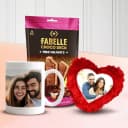 Delight your special someone with our Charming Love Combo Gift, designed to show your affection! This exquisite set combines a custom heart-shaped pillow, a unique coffee mug, and an elegant pack of Fabelle Choco Deck Mini Delights (163 gm). Perfect for birthdays, anniversaries, or any celebration, this combo is sure to create cherished memories. To personalize your gift, just send a high-resolution photo to designphotocake@gmail.com with your order number within an hour after placing your order.