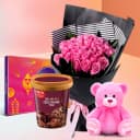 Make your Valentines Day more memorable with this lovely gift of Charming 24 Pink Roses Bouquet fabulously arranged with Kwality Walls Choc-n-Roll Choco Brownie Fudge Ice Cream Tub (700ml), Assorted Cadbury Celebration Pack (118g), and a 6 inch Soft Teddy and curve your name on the hearts of the people you love.