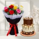 Cheerful Mixed Roses Bunch with Two Tier Chocolate Cake