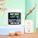 This is a gift of: - A Kundan Rakhi by Rakhi Sutra (PRRK8260) - Fun Quote Printed Mug For Bhai - Complimentary Roli Tika N Chawal - Complimentary Message Card with Free Rakhi Express your love and joy with the Cheerful Rakhi and Quirky Mug Bundle this Raksha Bandhan. This thoughtful gift set features a beautifully designed Kundan Rakhi by Rakhi Sutra (PRRK8260), showcasing fine craftsmanship. Complementing the Rakhi is a quirky quote printed mug, perfect for adding a smile to your brothers face every morning. The set includes all essential Rakhi ceremony elements, such as Roli Tika and Chawal. A complimentary message card with a free Rakhi helps you convey your heartfelt wishes. This gift combo blends tradition with fun, making your Raksha Bandhan celebrations truly special.