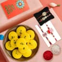 Celebrate Raksha Bandhan with our Cherished Rakhi Bundle, designed to strengthen bonds even when separated by distance. This exquisite set features a Family Rakhi that includes a Bhaiya Bhabhi pair alongside a joyful Kids Rakhi. To accompany this emotional gift, savor 500 grams of delicious Kesaria Peda that will delight your taste buds. Also included are Roli, Tilak, and Chawal, along with a complimentary message card, making your feelings known. This set perfectly embodies love and togetherness during this joyous occasion.