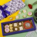 It Includes: - 2 Almond Chocolate Florentines, - 3 Almond Chocolate Rocks, - 4 Assorted Chocolates (Oreo, Fruit and Nut, Orange Crisp, Butterscotch), - 1 Diya. Ignite your taste buds with the magnificent assortment of handcrafted confections in our Choco Variety With Diya. Bursting with flavor and joy, each bite promises to transport you to a world of sweet indulgence and culinary bliss.As you lift the lid, youll discover a treasure trove of delectable treats waiting to be savored. Two almond chocolate florentines greet you with their delicate, crunchy textures and rich, nutty flavors. Their luxurious blend of almonds and chocolate will leave you craving for more.Next, youll encounter three almond chocolate rocks, each resembling a precious gem. These bite-sized delights tantalize your senses with a delightful combination of smooth, creamy chocolate and crunchy almonds. With every single bite, youll experience a symphony of textures and flavors dancing on your palate.The star of the show is the assortment of four assorted chocolates, each one a miniature masterpiece. From the classic Oreo chocolate, which combines the beloved cookies with velvety chocolate, to the fruity and nutty delight of the fruit and nut chocolate, every piece offers a unique and unforgettable experience. The orange crisp chocolate seduces you with its zesty citrus notes, while the butterscotch variety delights with its sweet, caramel undertones.Finally, tucked within this heavenly collection, youll find a diya, symbolizing the eternal light that accompanies festivities. Its intricate design adds a touch of elegance and spirituality, making this box not only a culinary adventure but also a thoughtful gift. Its a treat that will leave a lasting impression on your taste buds and brighten up any occasion with its burst of flavor and joy. Indulge yourself or spoil someone special with this extraordinary collection that is sure to create moments of pure delight.
