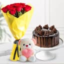 This gift combo has: - 10 Red Rose Bouquet - A Chocolate Cake (1Lb) - A Small Teddy Immerse your loved ones in the happiness with this mouth-watering 1/2 kg Chocolate Cake with 10 Red Rose Bouquet N a small Teddy that brings with it and fill their life with fun and cheer.