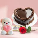This gift combo has: - A Single Rose - A Small Teddy - 4 pcs Ferrero Rocher Chocolates (1Lb) Drive your loved ones crazy with excitement by gifting them this delicious Chocolate Heart Shaped Cake with Single Rose, small Teddy N 4 pcs Ferrero Rocher Chocolates and make your mark forever in their hearts.