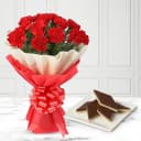 Chocolate Katli from Mithas Delicious Sweets with Red Carnation Tissue Wrapped Bouquet