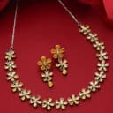 This gift box contains: - Silver Toned White American Diamond Studded Flower Shaped Necklace - A Pair of Matching Earrings Indulge in the enchanting beauty of this Classy AD Studded Flower Jewellery Set, a captivating ensemble that exudes sophistication and grace. Crafted with meticulous attention to detail, this exquisite jewelry set features a stunning floral design in radiant rose gold tones, exuding a sense of timeless elegance and femininity. The Silver Toned White American Diamond Studded Flower Shaped Necklace and matching earrings complement each other perfectly, creating a harmonious and cohesive look that is sure to dazzle on any occasion. The intricate craftsmanship and delicate detailing make this set a standout accessory, adding a touch of glamour to any outfit. Whether worn together for a coordinated look or separately to add a touch of elegance to your ensemble, this Rose Gold Floral Necklace Set is a versatile and glamorous addition to your jewelry collection. Elevate your style and make a statement with this beautiful jewelry set that is bound to turn heads and leave a lasting impression.