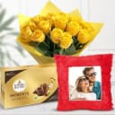 Elevate your gifting game with this exquisite set! Featuring a stunning custom cushion that can be personalized with your treasured photo, this gift is beautifully complemented by a bouquet of 15 vibrant yellow roses. As a delightful treat, indulge in a delectable box of 16 Ferrero Rocher Moments Chocolates—each bite a step towards happiness. Ideal for special occasions like birthdays, anniversaries, or simply to illuminate someone’s day, this present ensures a heartfelt connection. Don’t forget to send your favorite digital photo to designphotocake@gmail.com or WhatsApp at +91 9230721098 to personalize your cushion. This extraordinary offering combines beauty, indulgence, and personal touch—perfect for celebrating meaningful moments!