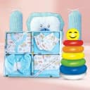 Present online this Cute Baby Dress Set with Toy N Cotton Pillows Gift Combo for your loving dears and make them smile. This Combo comprises of: 1. a. Item: 6 pc Dress Set for Infants containing 1 Shirt, 1 Pant, 1 Cap, 1 Hanky, 1 Pair of Shoes, 1 Pair of Mitten b. Age Group: Ideal for 0-3 Months c. Color: Blue d. Fabric: Cotton 2. a. Item: Littles Junior Ring b. Brand: Littles c. Material: Plastic d. Color: Multicolor 3. a. Item: Super Minis Cotton Baby Head Pillow with 2 Side Pillows b. Color: Sky Blue c. Age Group: 0-12 Months Note:- Country of Origin: India