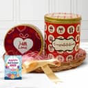 Feel great when you gift this Delightful Combo of Cookies N Chocolates and bring joy into the lives of the people you love on Birthday. This Combo contains 200 gm Crunchy Handmade Chocolates with 200 gm Seasam Cookies from Cookie Man in Tin Box, decorated in a Cane Basket with Birthday Card.