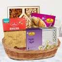 Make every event special with this beautifully arranged Gourmet Treats Basket, brimming with an enticing variety of snacks. This collection includes 200g of handpicked Assorted Dry Fruits packed with health benefits. Indulge in the sophisticated taste of 200g Haldiram Kaju Roll, a rich sweet delicacy made to perfection. For a delightful crunch, enjoy 200g of Haldiram Bhujia, a spicy and savory treat, alongside 200g of Haldiram Mini Samosa, a flaky and deliciously filled snack perfect for any gathering. This basket is an excellent choice for gifting during festivals, family gatherings, or to simply brighten someone's day.