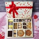 This chocolate box contains: - A Oreo Chocolate Bar - 6 pcs Assorted Chocolates With Truffle - 2 pcs Soft Filled - 2 Seeds Square - 2 pcs Almond Florentine - 5 pcs Almond Rocks - Coated Butterscotch - 2 Assorted Logs - 2 pcs cookies (Chocochips Cookie, Mixed Fruit N Nut Florentine Cookie) Dive into a world of decadence with our Deluxe Choco Selection Box. Experience the perfect blend of crunch and creaminess with a luscious Oreo Chocolate Bar. Indulge in the rich flavors of 6 assorted chocolates, each filled with velvety truffle centers, and savor the delight of 2 soft-filled chocolates. Discover the wholesome goodness of 2 seeds square, the exquisite crunch of 2 almond florentines, and the irresistible combination of 5 almond rocks. Let your taste buds dance with the delectable coated butterscotch, and indulge in the unique textures of 2 assorted logs. Complete your sweet journey with the delightful duo of Chocochips Cookie and Mixed Fruit N Nut Florentine Cookie, each a perfect balance of sweetness and crunch. This chocolate box is a thoughtful and delightful gift for any occasion, offering a symphony of flavors and textures to please every palate.