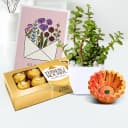 The Diwali Hamper consists of: - Diya - 8 pcs Ferrero Rocher Chocolates 100g - Jade Plant with Pot - A Free Message Card Make your loved ones Diwali celebrations extra special with our beautifully curated Diwali Greetings With Greenery Hamper. This thoughtfully designed hamper captures the essence of the festival of lights and is sure to bring joy and happiness to those who receive it. The highlight of this hamper is the stunning Diya, symbolizing the victory of light over darkness. Its radiant glow will illuminate any space, filling it with warmth and positivity. Indulge in the rich and delicious taste of Ferrero Rocher Chocolates, which are bound to leave your taste buds mesmerized. With 8 pieces of these decadent chocolates, this hamper is a treat for your sweet tooth. Adding a touch of tranquility to the festive season, the hamper includes a Jade Plant with a pot. Known for its healing and positive energy, this plant is a perfect gift to bring luck and prosperity to your loved ones lives. To make it even more personal, we have included a free message card where you can pen down your heartfelt wishes and greetings. Celebrate Diwali in style with our Diwali Greetings With Greenery Hamper, a perfect gift that combines the essence of the festival with love and happiness.