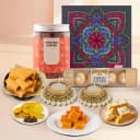 This Diwali Gift Box has: - Almond Peri Peri In A Jar- 100 gm - Mewa Fudge Bite -3 pcs - Orange Fudge Bite -3 pcs - Butter Scotch Fudge Bite -3 pcs - Ferrero Rocher- 4 Pcs - Gold Coin Shaped Chocolate - Designer Pearl T-Light Candle - Set of 2 - Designer Festive Reuseable Mandala Box Celebrate the spirit of Diwali with our festive feast gift box. Indulge in the deliciousness of Kaju Katli and Milk Cake, and let the luscious Cadbury Dairy Milk Silk tantalize your taste buds. This gift box is a true delight for Diwali enthusiasts who want to treat themselves to an array of mouthwatering flavors and make their festivities truly memorable.