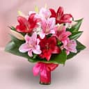 This floral arrangement has: - Red Anthodium - Pink Lilies Convey your heartfelt wishes by gifting this Elegant Bouquet of Red Anthodium n Pink Lilies to the people dearest to you.