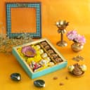 The Gift Includes: - Diwali Gift Box - Chana ladoo, 125 gm - Almond Tart Baklava 125 gm - Diya - Ganesh Laxmi Idol - Diwali Greetings Card Celebrate the festival of lights with our Elegant Diwali Gift And Sweets Box. This beautifully curated gift box is the perfect way to convey your warm wishes and spread joy to your loved ones. Inside this elegant box, you will find a delightful assortment of traditional treats. Indulge in the rich and delicious flavor of our 125 gm Chana ladoo, made with love and pure ingredients. Its the perfect blend of sweetness and texture, sure to satisfy your taste buds. Not only that, but our gift box also includes 125 gm of Almond Tart Baklava, a heavenly combination of crunchy almonds and flaky pastry, creating a truly irresistible treat. Adding to the charm of this gift box is a Diya and Ganesh Laxmi Idol, symbolic of prosperity and auspiciousness. Light up the Diya and seek blessings from the divine Ganesh Laxmi during this auspicious time. To make the gift more personal, weve included a Diwali greetings card, where you can pen down your heartfelt messages and wishes. Presented in a beautiful Blue Window box, this Diwali gift box will surely leave a lasting impression on your loved ones. Its the perfect way to celebrate the joy and togetherness of this festive season.
