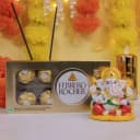 This gift set includes: - Marble Abhaya Mudra Ganesha - Ferrero Rocher Chocolate (100g) Experience the joy of thoughtful gifting with our stunning Marble Abhaya Mudra Ganesha accompanied by a box of delightful Ferrero Rocher chocolates. The exquisitely designed Ganesha represents wisdom and removes obstacles, making it an inspiring gift for family or friends. The creamy, nutty Ferrero Rocher chocolates will instantly satisfy any sweet tooth, creating a beautiful contrast to the serene statue. This combination serves as a perfect symbol of love and blessings, making it suitable for various occasions from birthdays to festivals. Share this heartfelt gift set and spread joy and positivity.