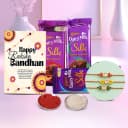 Celebrate Raksha Bandhan with a touch of elegance! This exclusive Kundan Rakhi and Chocolate Delight set combines traditional charm and modern sweetness. Featuring three beautifully crafted Kundan Rakhis, each representing your unique bond with your sibling, alongside an assortment of Cadbury Dairy Milk Silk chocolates—each piece a velvety treat that will delight any chocolate lover. The set also includes a complimentary Roli Tika and Chawal for the traditional rituals, plus a heartfelt message card to convey your emotions. Elevate your festivities with this perfect combo that deepens bonds and creates lasting memories!