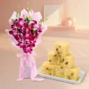 This gift combo includes: - 8 Ochids Bouquet - Soan Papri (250 Gms) This sophisticated gift combo includes a stunning bouquet of 8 elegant orchids, showcasing their exotic beauty and grace, alongside 250g of delightful Soan Papri. The orchids, with their unique petals and vibrant colors, are perfect for conveying admiration and appreciation. Paired with the flaky, sweet Soan Papri, made from a blend of flour, sugar, and cardamom, this combo creates a delightful harmony of visual and culinary delights. Ideal for celebrating milestones, achievements, or simply to brighten someone’s day, this gift is a thoughtful gesture that combines elegance and taste in the most delightful way.