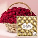 Indulge your senses with the Elegant Rose and Chocolate Gift Set. This stunning ensemble showcases 50 radiant red roses, gracefully arranged in a beautiful basket, paired with a gourmet box of 24 Ferrero Rocher chocolates. Perfect for any occasion, this gift expresses love and appreciation while creating a warm, celebratory atmosphere. Surprise your special someone with this delightful combination, ensuring they feel cherished and adored.