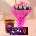 Have an exotic Valentines Day with your loved ones by gifting them this Enigmatic 8 Pink Roses Bouquet in a tissue wrapping fabulous arranged with Kwality Walls Choc-n-Roll Choco Brownie Fudge Ice Cream Tub (700ml) and Cadbury Dairy Milk Chocolate Bar (140g) to cast a magical spell upon them.