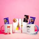This is a gift of: - One Bhaiya Bhabhi Kundan Zardosi Rakhi Set (KPRK0313, LRVL2293) - 2 pcs Cadbury Dairy Milk Chocolates (Roast Almond, Crackle) - 2 pcs Printed Coffee Mug for Bhaiya n Bhabhi - Complimentary Roli Tika N Chawal with Small Thali, - A Free Message Card This Raksha Bandhan, gift your Bhaiya and Bhabhi a celebration wrapped in elegance and warmth. The Kundan Zardosi Rakhi Set (KPRK0313 & LRVL2293) features traditional artistry in multicolored tones—radiating love, respect, and festive charm. Add sweetness with two Cadbury Dairy Milk chocolate bars (Roast Almond and Crackle) and bring everyday joy with a pair of printed coffee mugs meant just for them. A small ceremonial thali with Roli Tika and Chawal adds the sacred touch of tradition, while a free message card allows you to share your personal wishes. This well-rounded gift box is a heartfelt way to honor cherished bonds.