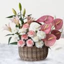 This flower arrangement has: - 8 Pink Carnations - 8 White Carnations - 5 Pink Anthuriums - 3 Stems Pink Lilies (3*3 buds/flowers) - Arranged in a Basket Deliver happiness by sending this Eternal Pink Flowers Basket to make others happy.