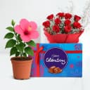 Delight your loved ones with this beautiful gift set featuring a vibrant Tropical Hibiscus plant paired with a stunning bouquet of twelve bold red roses and a rich Cadbury Celebration pack. Whether celebrating a special occasion or simply expressing your affection, this arrangement captures the essence of love and appreciation. The indoor hibiscus stands gracefully between 3 to 7 inches in a chic plastic pot, perfect for enhancing any living space. The roses add a touch of romance, while the delectable chocolates offer a sweet finishing touch. Make any moment unforgettable with this exquisite gift!