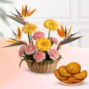 This gift combo includes: - Mixed Flowers Arrangement (3 Gerberas,4 Carnations and 3 Birds of Paradise) - Malpua (10 Pcs) Celebrate the beauty of nature and the richness of tradition with this remarkable gift combo. The mixed flower arrangement, featuring 3 vibrant gerberas, 4 delicate carnations, and 3 exotic birds of paradise, offers a captivating display of color and form. Accompanied by 10 pieces of delectable Malpua, a classic Indian sweet with a golden, syrupy texture, this combo is perfect for adding a touch of festivity to any occasion. Whether for a loved one or as a special treat for yourself, this floral and sweet combination is sure to bring joy and delight.