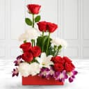Brighten someone's day with this captivating botanical arrangement! Our exquisite floral basket features an enchanting mix of six gorgeous purple orchids, ten elegant white carnations, and twenty romantic red roses. Topped with a singular, elegant white lily, this ensemble symbolizes purity and grace. Perfect for any occasion, whether it be a joyous celebration or a heartfelt apology, this stunning arrangement is a beautiful expression of your feelings. Let the flowers convey your love in the most delightful way while captivating smiles and hearts alike.