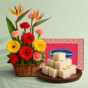 Experience the joy of giving with this exquisite package featuring a colorful floral arrangement and a delectable coconut treat. Delight in the beauty of three gerberas, four carnations, and three vibrant birds of paradise, each symbolizing joy and affection. Complementing this stunning bouquet is a box of luscious coconut barfi, made from the finest ingredients. Perfect for any celebration or to bring a smile to a loved one's face, this combo delivers sweetness and beauty in one charming package.(Only Available at Bangalore)