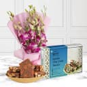 Make your loved ones feel special with this enchanting gift combo! Featuring a delightful 500 gms of Khajur Anjeer Bites from Kandoi Bhogilal Mulchand, accompanied by a beautiful bouquet of 10 orchids, it's a perfect way to express your love and appreciation. The sweet, rich flavors of the bites will tantalize their taste buds, while the vibrant orchids add a touch of elegance to this thoughtful gesture. Ideal for celebrations or just to brighten someone’s day, this gift is sure to create lasting memories. Note - Only Available at Ahmedabad