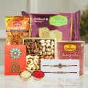 Celebrate the bond of love this Raksha Bandhan with our Exquisite Rakhi Festivity Hamper! This thoughtfully curated collection is designed to bring joy to your brother's heart. Imagine the joy on his face as he unwraps this treasure trove of delicious treats. The hamper includes 200 grams of assorted dry fruits for a healthy indulgence, complemented by a delightful 1 kilogram of Haldiram's luscious rasgulla that bursts with flavor in every bite. As an additional treat, savor the airy 200 grams of Haldiram's soan papdi, which offers a melt-in-your-mouth experience, alongside a crunchy 200 grams of Haldiram's chanachur for a perfect contrast of flavors. Two beautifully designed rakhis add a personal touch, and with traditional roli, tilak, and chawal included, you'll be all set for the rituals. Plus, don't forget the complimentary message card to convey your loving sentiments. This hamper is a perfect blend of tradition and festivity!