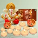 This Diwali Gift Hamper Has: - Designer Glowing Ganesh Idol - Cadbury Temptaions Almond Treat -1 Pc - Scented T-Light Candles - 10 Pcs - Designer Clay Diyas- Set Of 2 Elevate your Diwali celebrations with our Festive Glimmers gift hamper. It features a mesmerizing Glowing Ganesh Idol that exudes divine radiance and brings prosperity to your home. Alongside it, you will find a duo of intricately designed Designer Clay Diyas, adding a touch of elegance and tradition to your festive decor. Illuminate your festivities with this enchanting combination.